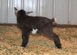 Southern Grace Shoot ToTheMoon, "Rocket" was bred by Southern Grace Nigerian Dwarf Goats in Lone Grove, Oklahoma. Rocket was owned by Cedar Creek Mini Nubian Farm. He is polled and carries the chocolate modifer making his black coat appear brown. Rocket also has a partial white belt and white poll, though his ears are solid. More on his genetics can be found on the ADGA genetics webpage here.